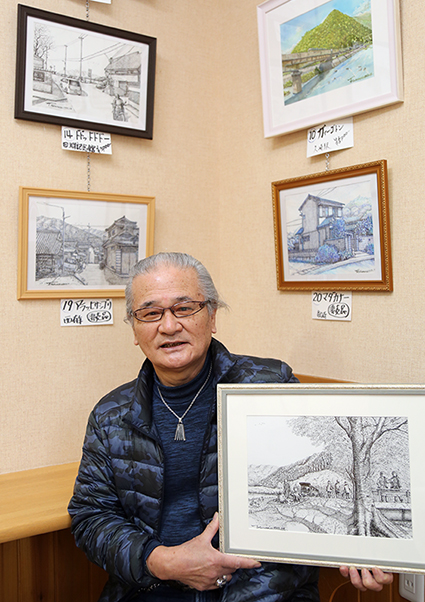 ボールペンで描いた風景画などを展示している徳丸透さん