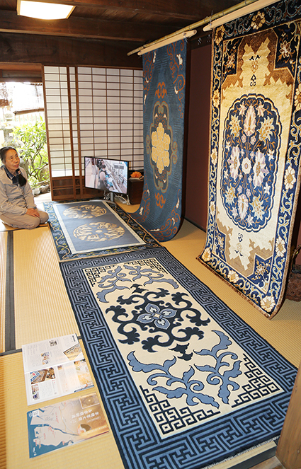 「赤穂緞通を見たことがない人に風合いを感じてほしい」と観光客が多く訪れる旧坂越浦会所を会場に選んだ。一番好きな文様だという「藍地花文」など一畳敷7点と小サイズ5点を展示。一畳敷の一つは通常の赤穂緞通に使われる綿糸ではなく9色の絹糸で織り上げ、質感が滑らかだ。