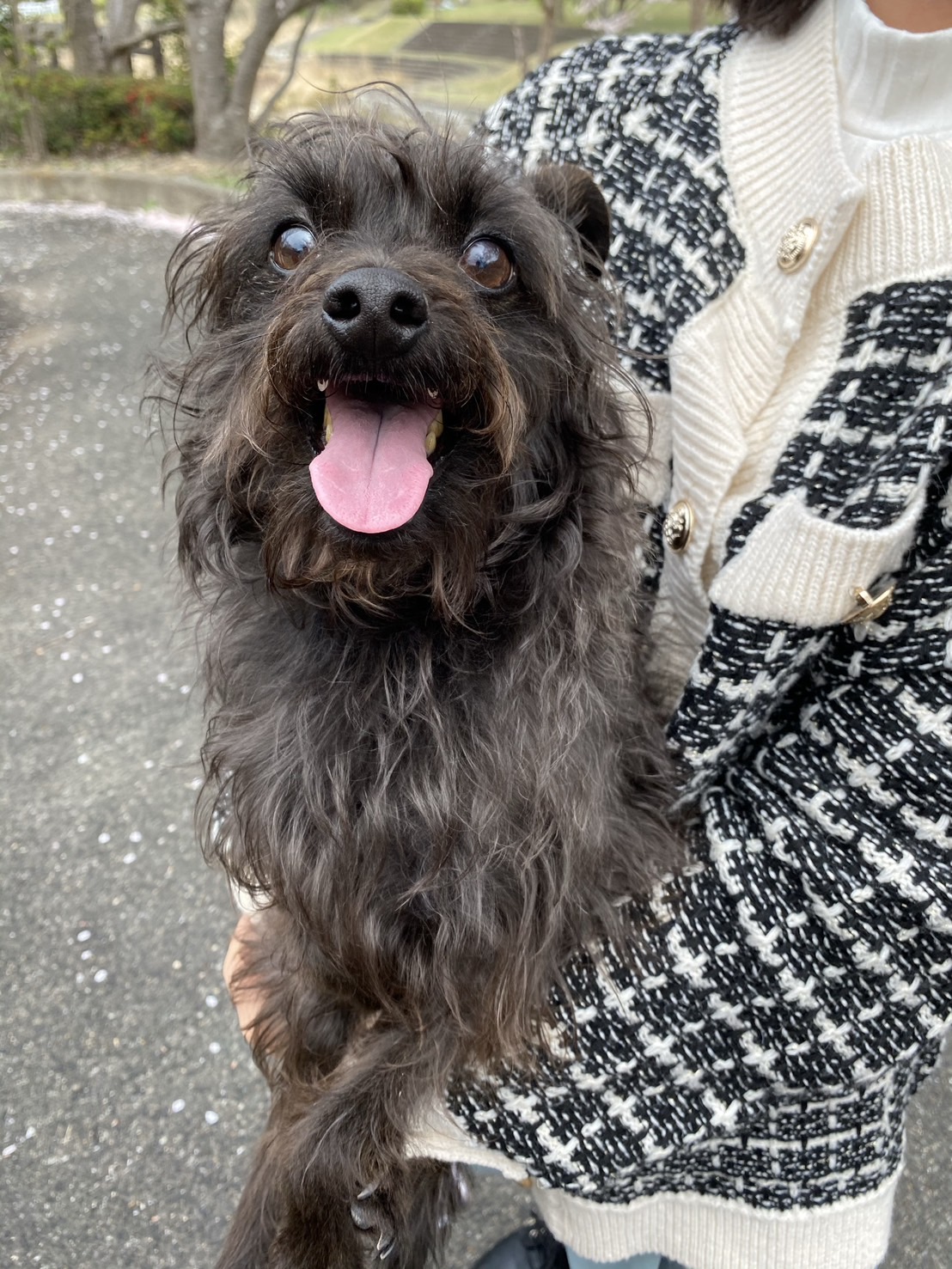トイプードルとピンシャーのミックスで7歳のオス。毛色は黒で、口の周りだけ茶色。首輪はしていない。