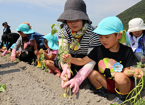 例年借りていた園舎近くの菜園が地区の集会所用地となったため、孫が同園に通う大津の農業、赤松良平さん(86)が自分の畑の一部を耕して提供した。鳴門金時の苗を一人2本ずつ受け取った園児たちは畝に沿って等間隔に並んでしゃがみ、PTA役員が移植ごてで土を浮かせたところに苗を差し込んだ。