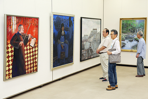 山手町の橋本美由紀さんが女性に花を重ねた水彩画「華」(F50号)は題名のとおり色華やかな作品。御崎の米谷勝利さんは細密な点描で心象風景を描いたアクリル画「山望(やま、のぞむ)」(F50号)を出品。大津の吉村東洋子さんがパリの飲食店をモチーフにした油彩画「小さな厨房」(F8号)は小品ながら印象的な一枚だ。
