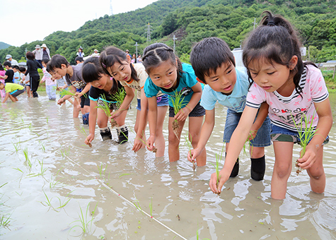 田植え作業を体験した坂越小の子どもたち