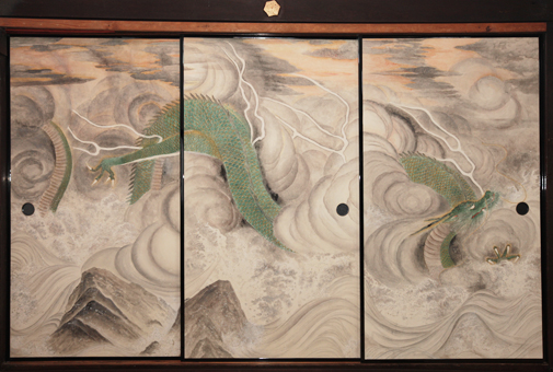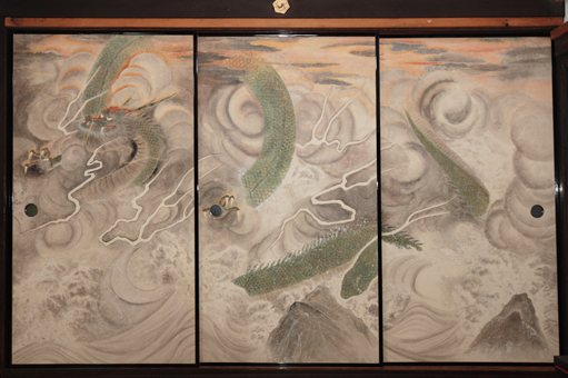 改修に合わせて、仏画の個展を開いたこともある坊守の慈恵さんが本堂のふすま絵を新調。山号寺号にちなみ、夕照の雲間を躍動する龍を左右一対6面に描いた。
