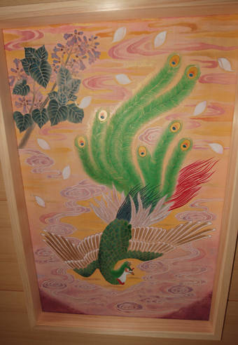 本堂横に改築した客間の天井画も慈恵さんの作。瑞兆を示す鳳凰を極彩色で描き、荘厳華麗な一枚に仕上がっている。