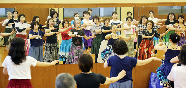 7月から週1回の教室を新規に始める同体育館が「楽しさを知ってほしい」と開いた。受講者たちは貸し出されたフレアスカートを身につけ、腰を小さく左右に振りながら足踏みするステップ、波のように揺らす手の動かし方など基本の動作を教わった。