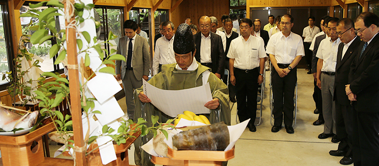 神事は雨のため境内の堂宇で行われ、木村公一宮司が祝詞を奏上。参列者が玉串を捧げた。