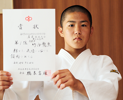 試合数が増える全国大会へ向けてスタミナを強化するため、「さらに厳しい稽古に取り組む」という竹内君。「最後まで攻め続ける自分のスタイルで全国優勝を狙いたい」と意気込んでいる。