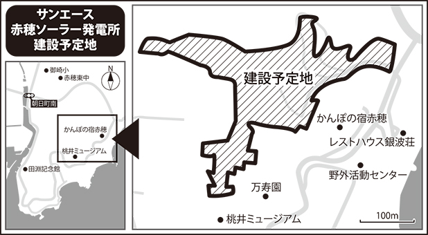 事業者は建設に必要な赤穂市の許可をすでに取得。甲子園球場よりも広い計画面積に地元からは自然環境と災害への影響を懸念する声が上がっている。