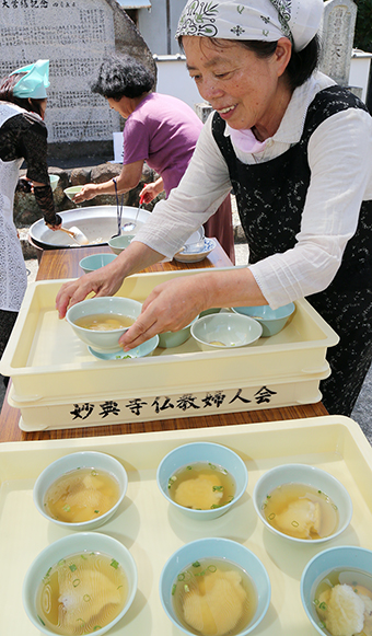 だし汁に小麦粉を練った団子を数個浮かべ、具材は薄く輪切りしたサツマイモと刻みネギ。門徒の女性が約300杯を調理した。