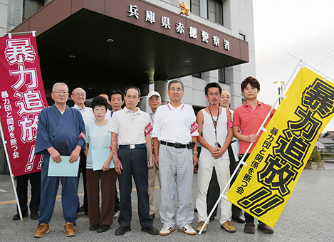 暴力団の入店拒否を徹底するためのパトロールに集まった「暴力団と関係を断つ会」メンバー