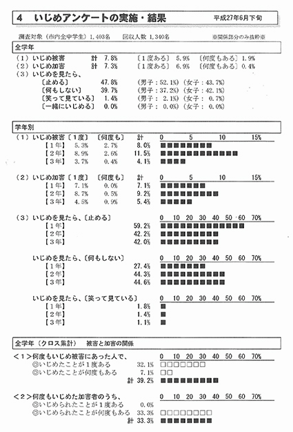 「この一年間でいじめを受けたことがありますか」の問いに、「ある」と答えた生徒は7・8%(昨年値22・2%)。また、「この一年間でいじめをしてしまったことがありますか」との問いに「ある」と答えた割合は7・3%(同22・8%)で、いずれも昨年に比べて約3分の1に減った。