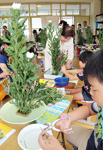 生け花は初めてという藤原咲(さき)さん(8)=3年=は「きれいに仕上げたい」と真剣なまなざしで花ばさみを扱った。伊勢さんは「子どもたちの“楽しい”という声が聞けたのが何よりです」と喜んでいた。
