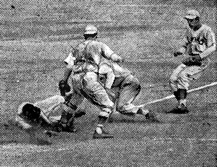 滝川−赤穂戦3回裏1死2、3塁、スクイズで滝川が先制した場面=朝日新聞社提供