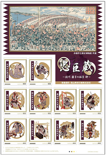 浅野内匠頭長矩と討ち入り装束の浪士を切手一枚に一人ずつ家紋と重ねてデザイン。フレーム上部にも國芳が描いた忠臣蔵錦絵(赤穂市立歴史博物館蔵)を配した。