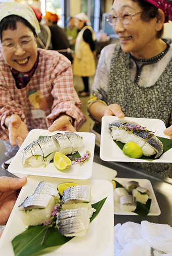 この日はボランティアグループ「赤穂市いずみ会」(西森昭子会長)のメンバー8人を講師に、背開きにしたつなしに塩をまぶす下ごしらえを教わった。あらかじめ仕込んでおいたつなしを寿司飯にかぶせてラップで包み、重しを乗せた。