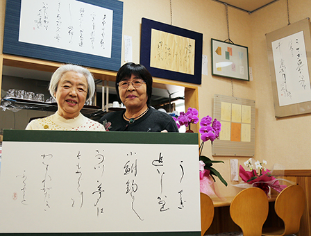 書作展を開いている藤原まゆみさん(右)。左は師匠の北國千津子さん