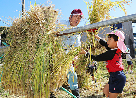 ハゼ掛けも体験した神米収穫