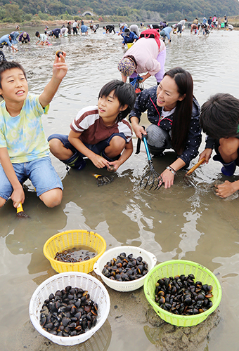 引き潮で浅くなった川底を熊手やスコップで漁ると、砂地の間から2〜3センチほどのシジミがゴロゴロ。参加した人たちは「アサリくらい大きい」「こんなに採れると思わなかった」と喜々としてバケツや袋に放り込んだ。