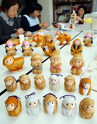 展示を主管する手芸サークル「木目込こてまりの会」(代表・久野朝代さん)の会員約60人が出品。久野さんから指導を受けた夏休み子ども手芸教室の受講児童50人の「寿宝ごま」などを含め約150点が並ぶ。