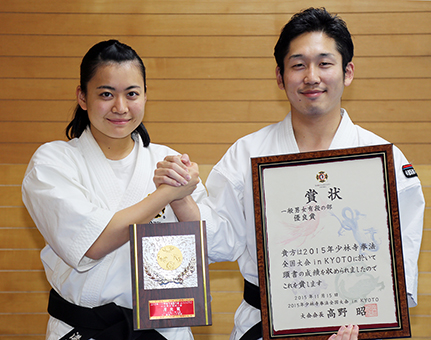 少林寺拳法全国大会で3位に輝いた奥谷宜晃さんと溝田春香さん