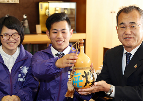 この日は3年の横山昇一君(17)と2年の吉森千賀さん(16)の生徒会役員2人が赤穂市役所を訪れ、ひょうたんを明石市長へ贈呈。仮設住宅の高齢者と一緒にひょうたんの絵付けを楽しみ、ひょうたん製の交通安全ストラップを商店街で配布するなどした現地での活動を報告した。