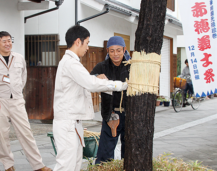 お城通りで行われたクロマツのこも巻き作業