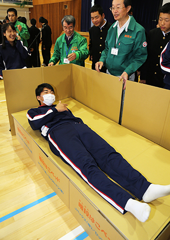 段ボールベッドの組み立ても体験した松原町の防災訓練