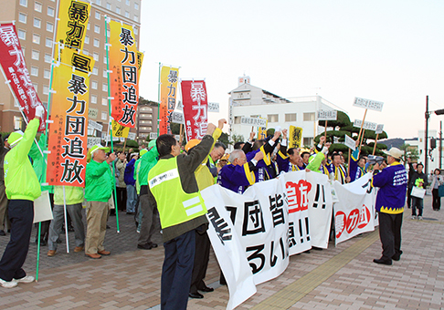 同大会は「赤穂暴力団と関係を断つ会」が発足した平成4年から毎年行われ、24回目。主催者を代表して明石元秀市長、「赤穂暴力団と関係を断つ会」の藤野高之会長、宇仁貫一・赤穂警察署長があいさつした。福岡県内初の民間暴対組織として5年前に設立した「早良・城南暴力団等排除推進協議会」から原口信一会長が来場し、「運動を全国に広げていこう」と呼び掛けた。