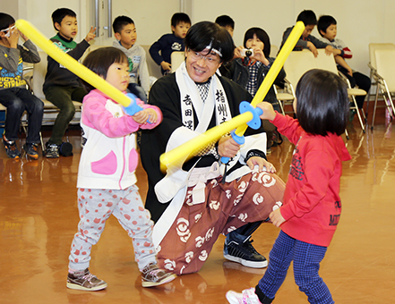 自宅で兄と新聞紙を丸めてチャンバラごっこをすることがあるという板屋町の小学3年、藤田雄大君(9)は「相手と刀を合わせるところがおもしろかった」。末岡さんは「チャンバラは相手と呼吸を合わせないと成り立たない。子どもたちには遊びを通してルールを守ることの大切さを学んでいってほしい」と話していた。