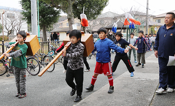 今年は中広、中洲、城南、千鳥の小学3〜5年生56人で編成。保存会の担当理事、千崎利幸さん(66)ら大人たちの指導で11月8日から毎週日曜日と祝日に練習を重ねてきた。この日は明石市長から「いい思い出になるように、しっかり頑張って」と励まされた。