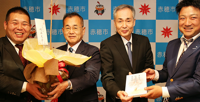初版本は非売品で義士の人数にちなんだ限定47冊。両市の小学校と図書館に寄贈する。この日は小川理事長が赤穂への寄贈分14冊を明石元秀市長と尾上慶昌教育長へ手渡した。
