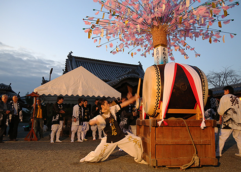 吉良上野介ゆかりの西尾市と赤穂市との友好を深めようと、吉良吉田三区青年部の一行29人が来穂。高さ4メートルほどの花飾りを冠した三尺太鼓を男衆が代わる代わる打ち鳴らした。観客は迫力ある音色とともに、両足を前後に大きく開いて豪快にバチを振るう姿にも引き込まれた。