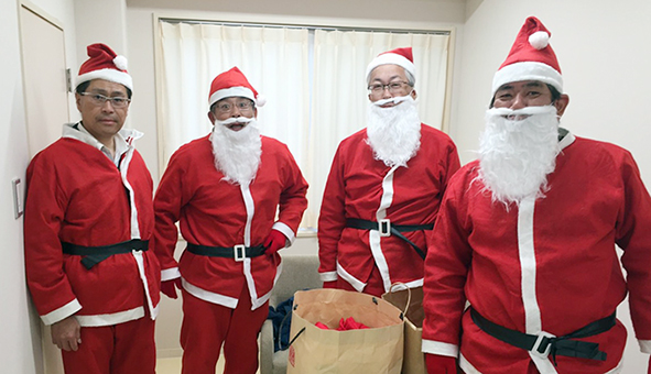 市内の高齢者福祉施設6カ所に甘酒を贈呈。大津の赤穂精華園では会員4人がサンタクロースに扮し、児童寮の41人にお菓子の袋詰めをプレゼントした。