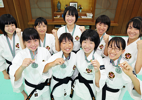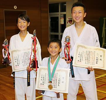 ▼空手道の糸東会全国選手権で優勝=形・小2男子の部で高野の三村泰生君(8)がV。組手では元沖町の入潮凜都君(15)が中3男子の部で、妹の虹都さん(13)が中1女子の部でそろって5位。