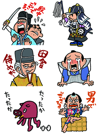 ▼忠臣蔵のLINEスタンプ発売=忠臣蔵の登場人物や名場面を図案にした40種類。熱烈な忠臣蔵愛好家で赤穂観光大使でもあるイラストレーター、もりいくすおさん(49)=東京都港区=が制作。