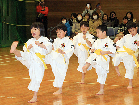 模範演武では少年部の子どもたちが元気いっぱいの気合いとともに突きや蹴り。中・高校生の拳士たちは引き締まった雰囲気の中、スピード感のある演武を披露した。1月に初段に合格した団員4人に印可状を授与したほか、皆勤賞や精勤賞などを表彰した。