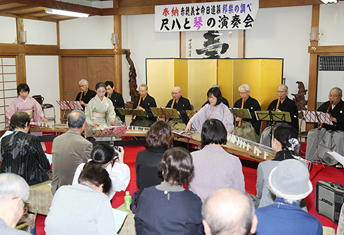 「討ち入りで本懐を遂げた日だけでなく、命日も義士の遺徳を偲ぼう」と赤穂芸能文化協会(三曲会、篠原昌三会長)が昨年に続いて主催。和装姿の18人が出演し、「哀歌」「朝露」など11曲を奏でた。会場の儀式殿は参拝者約60人で満席となり、おごそかに響く邦楽の調べに静かに耳を傾けた。