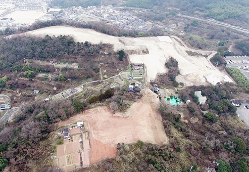 草木が伐採されて地肌がむき出しになったメガソーラー建設地の空撮画像=4日撮影、御崎地区連合自治会提供