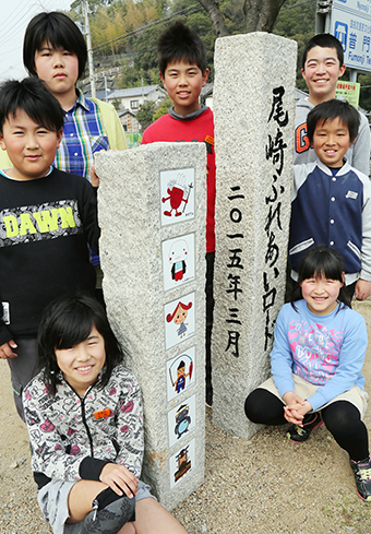 子どもたちが考えた愛称とキャラクターをあしらった記念碑