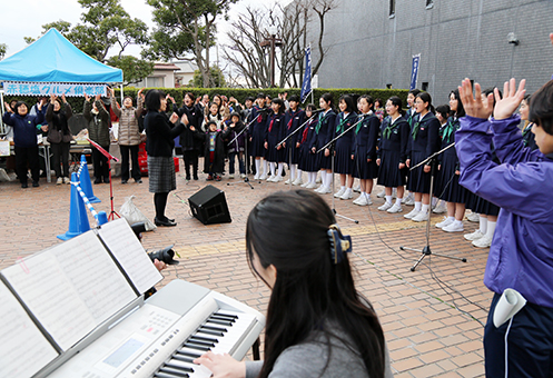 オープニングで中学校コーラス部や手話グループが復興応援ソング「花は咲く」を合唱した追悼イベント