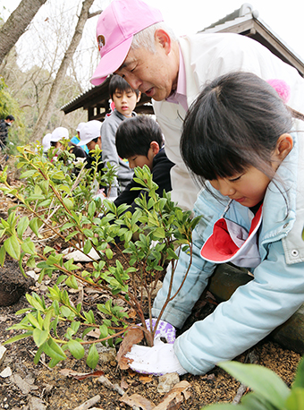 クラブの活動理念を地域へ示す「ロータリーデー」活動の一環で会員20人が参加。地元まちづくりグループ「さこし船岡を良くする会」(牟禮宗弘・世話人代表)も協力し、遊歩道沿いにドウダンツツジ70本、坂越湾を一望できる東屋「縮遠居」のそばにヒラドツツジ40本を植えた。