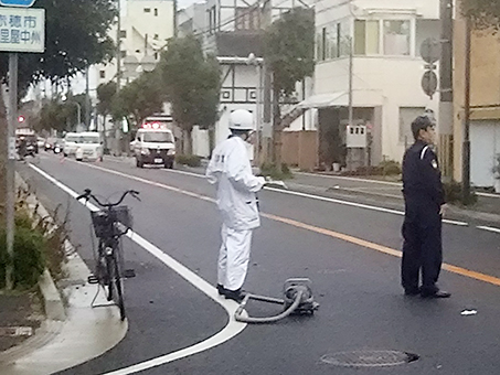 ひき逃げ事件の発生現場で遺留品を調べる捜査員。男性が乗っていた自転車が残っていた=3月18日午後5時45分ごろ撮影