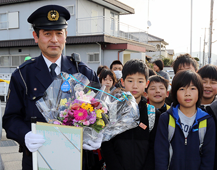 姫路市内で家業の建材会社を手伝うために今月末で早期退職することになり、この日が最後の交番勤務。児童たちは子ども会が用意した寄せ植えと手紙、色紙を登校途中に池添巡査長に手渡し、「今まで僕たちの安全を見守ってくれてありだとうございました」と感謝を伝えた。
