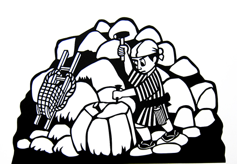 毎日毎日、雨の日も、風の日も、夏の日照りの中でも、寒い冬の日でも、こつこつと運び続けた。(作・切り絵 村杉創夢)