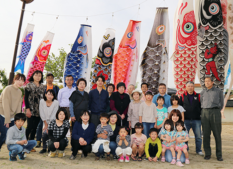 大町自治会が毎年掲揚する鯉のぼり。ロープを横に渡して記念撮影