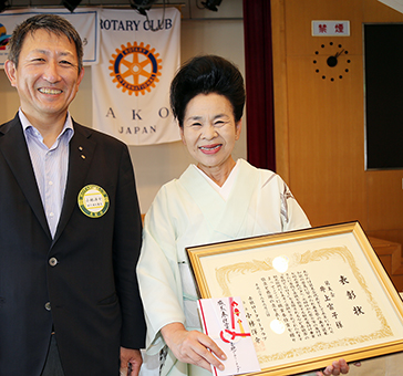 赤穂ロータリークラブから職業奉仕賞を贈られた井上富子さん