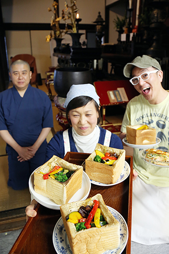 先月31日にあった第2回には中学生を含む7人が参加した。本堂で10分ほどの坐禅を組んでから台所がある庫裏へ。この日のメニューは「牛すじと夏野菜のカレーパン」と「皮付きニンジンサンド」の2種類。