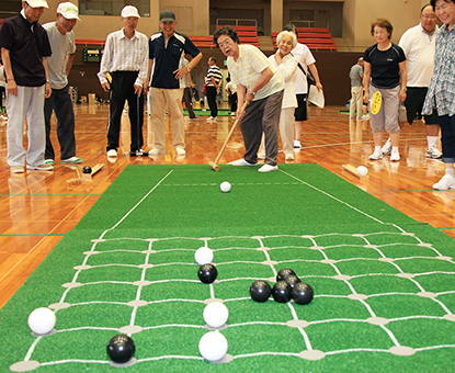 ボールの色で黒チームと白チームに分かれて対戦する競技。スティックで打ったボールを縦横7目のくぼみがある専用マットに転がし、くぼみに止まった球の数や一列に並んだ数でポイントを競う。
