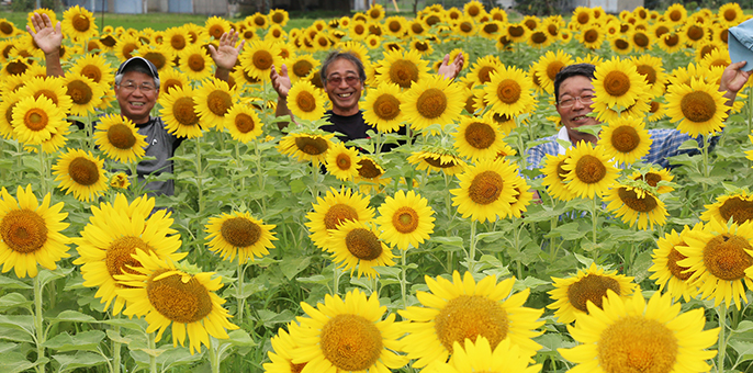 地域活性化と農業振興などを目的に木津自治会(溝田泰司会長)が主催し、今年で3回目となる。大輪の花をつける「ハイブリッドサンフラワー」を5月に播種。自治会員らが交替で週1回の除草作業を頑張り、約30アールを作付けた。