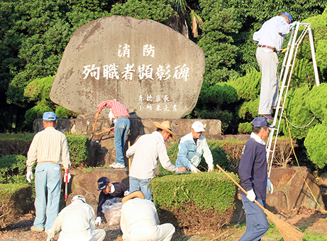 「消防殉職者顕彰碑」の周辺を美化清掃する「緋ぐるま会」のみなさん